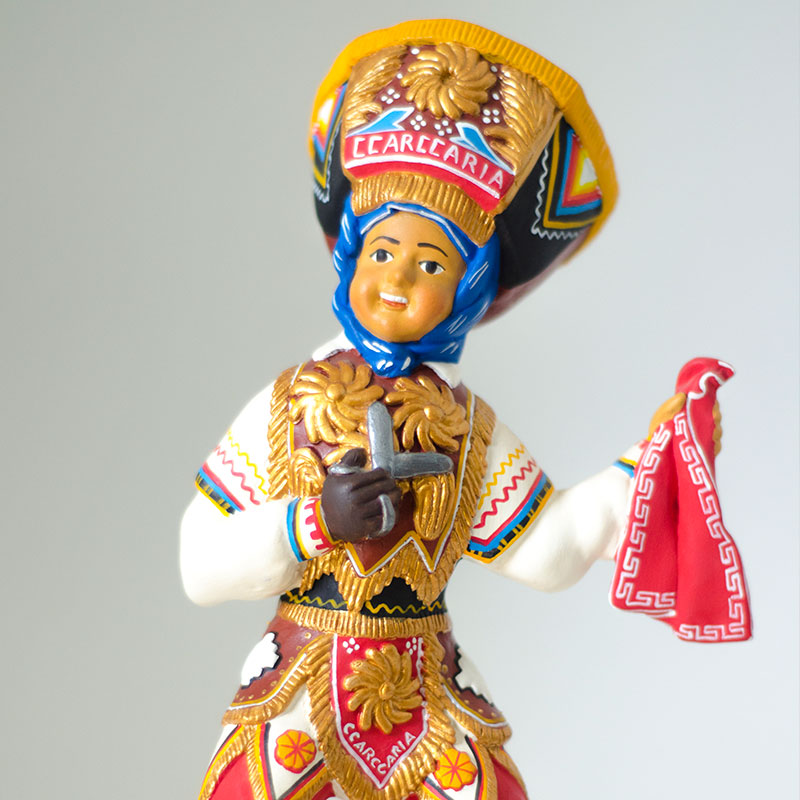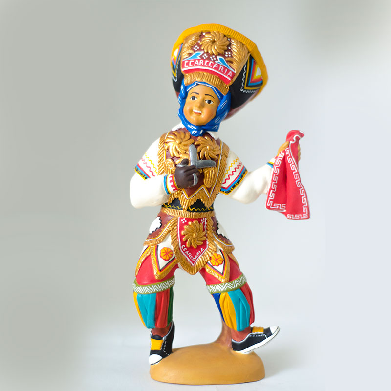 Antauro Orellana crea estas hermosa estuatilla hecho con arcilla y pintadas a mano. Esta pieza encantadora representa al danzante de las tijeras ,el cual hace ritual con tijeras y forma de baile en competición . Los danzantes bailan por turnos retándose uno al otro a superar el riesgo de los pasos y malabares que estos realizan.
